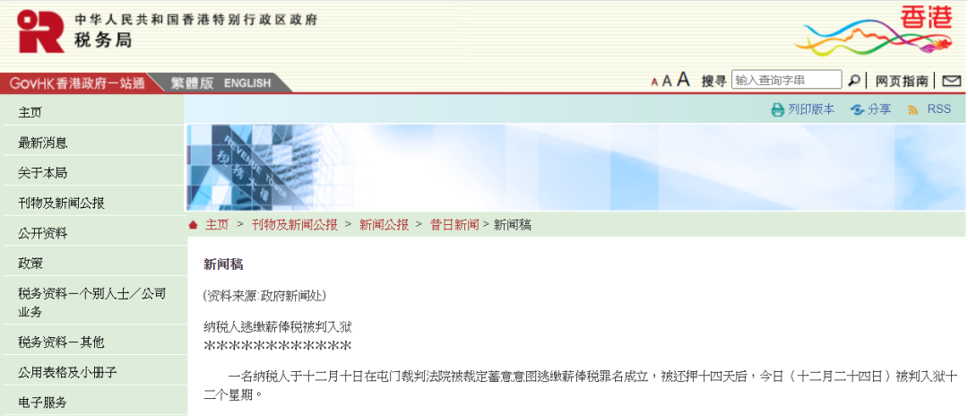 香港稅務(wù)局官網(wǎng),會定期公布的關(guān)于相應(yīng)逃稅違法行為的案例,這是最新的通告案例:12月24日,香港稅務(wù)局發(fā)布新聞公報 “一名納稅人被法法院裁定蓄意意圖逃稅罪名成立”