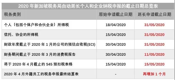 2020年4月4日,新加坡稅務局(IRAS)根據(jù)COVID-19情況的最新措施,作為對納稅人的支持,新加坡稅務局(IRAS)自動延長個人和企業(yè)納稅申報的截止日期如下:
